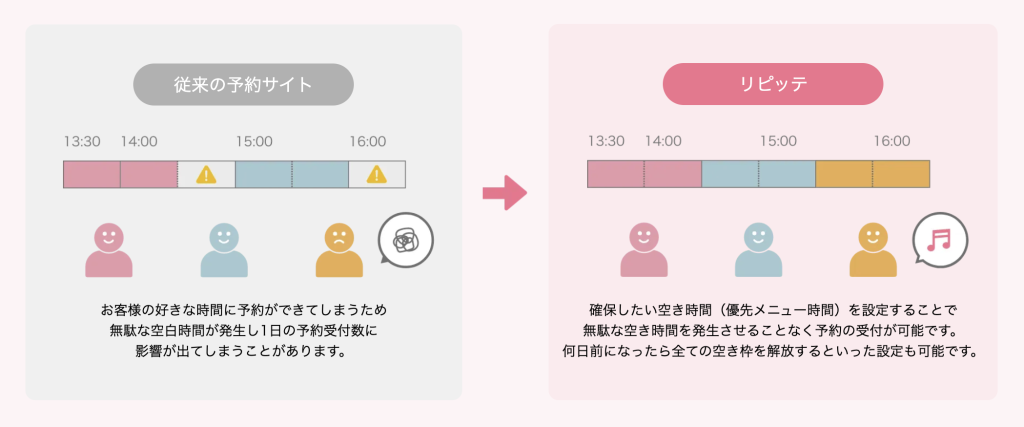 予約時間と予約時間の間に中途半端な時間ができてしまうと、その時間が無駄な空白時間となり、本来売り上げが立っていたはずの機会を損失してしまいます。
