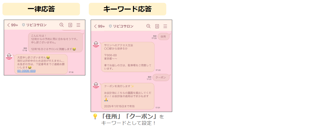 種類は、一律応答とキーワード応答の2種類がございます。一律応答では、どんなメッセージに対しても同じ応答が行われます。一方、キーワード応答では、事前に設定したキーワードに反応し、そのキーワードが含まれるメッセージにだけ自動応答が送られます。