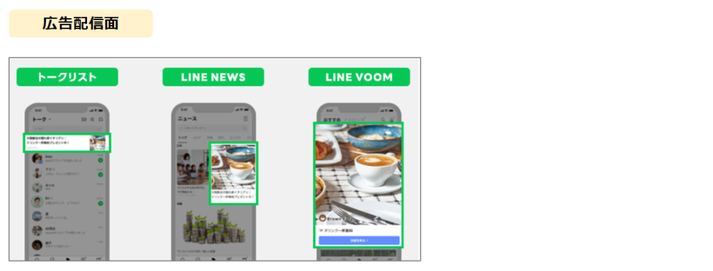 広告は、LINEアプリ内のトークスクリプト上部やLINE NEWS、LINE VOOMに表示され、国内9,700万人が利用するLINE上に表示されるのが大きな特徴です。