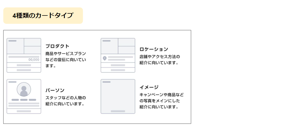 情報を整理して送信することができるため、商品やメニュー、スタッフなどを並べるのが効果的です。4種類のカードタイプから選択でき、最大9枚のカードを設定できます。