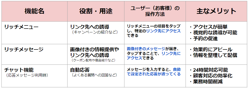 LINE公式アカウントには、リッチメニューだけでなく、チャット機能やリッチメッセージなど、さまざまな機能が搭載されています。それぞれの機能には特定の役割があり、正しく使いわけることで、サロンの売上増加やリピーターの確保に大きな効果があります。