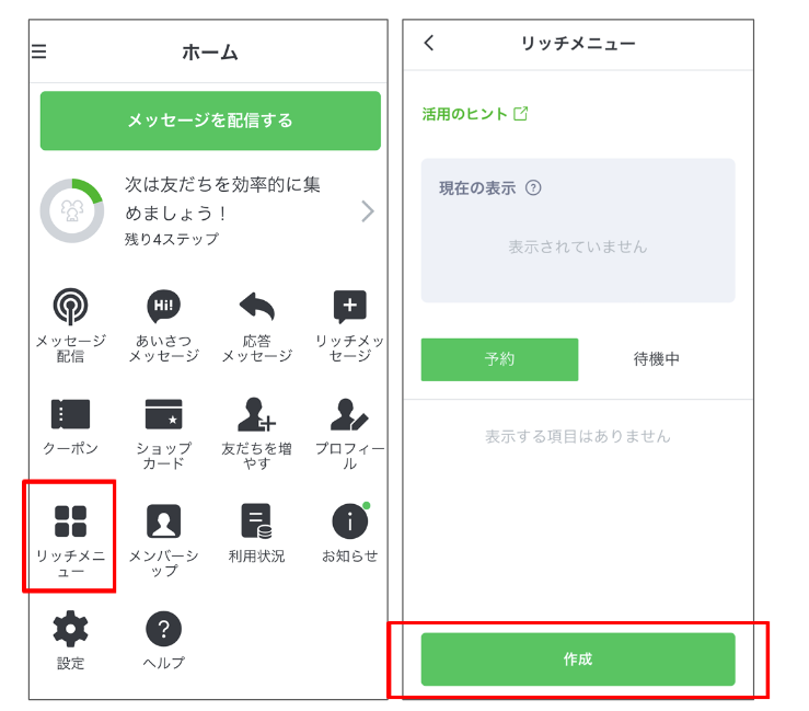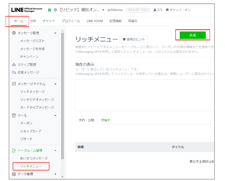 ②ホーム>リッチメニュー>作成をクリック