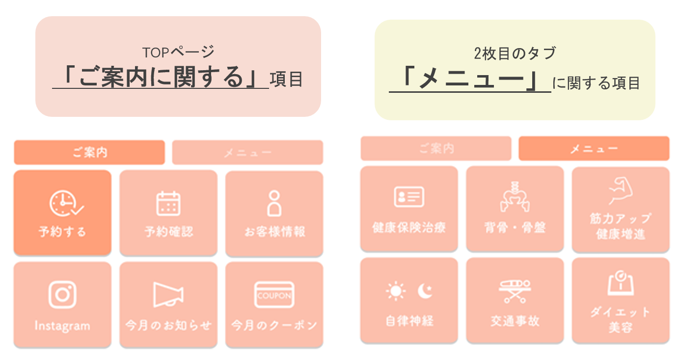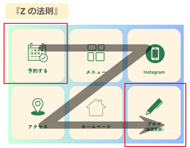 例えば、最も重要な情報を左上に配置し、顧客にとって有益な情報やアクションを促す要素を右下に配置することで、自然な視線の流れに沿って全体を確認してもらいやすくなります。これにより、予約ページやクーポン情報などの重要なコンテンツに顧客がアクセスしやすくなり、顧客体験の向上やコンバージョンの増加が期待できます。