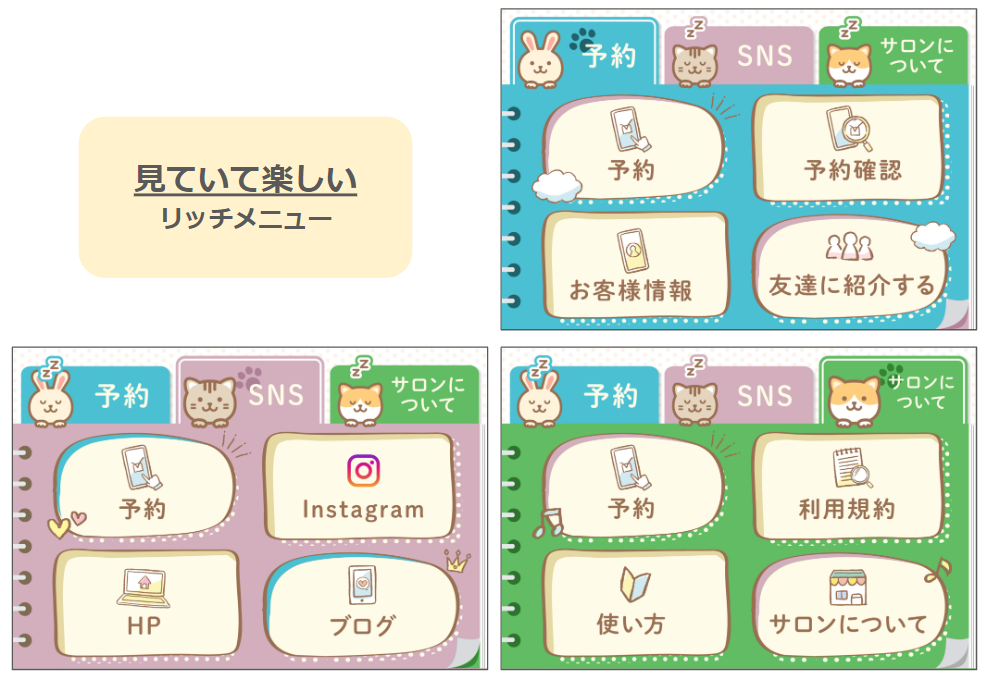 リッチメニューの色や画像を、サロンの雰囲気やイメージカラーに合わせることで、オリジナル性を表現することができます。これにより、他のサロンとの差別化が図れ、顧客の記憶に残りやすいサロンになる可能性が高まります。