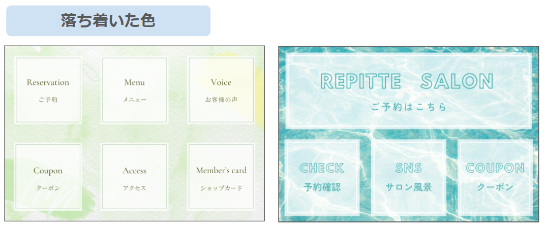 リッチメニューに使う色として、ブルーや緑も効果的です。これらの色は、リラックス効果があり、長時間見ても疲れにくいため、サロンの落ち着いた雰囲気を伝えるのに適しています。