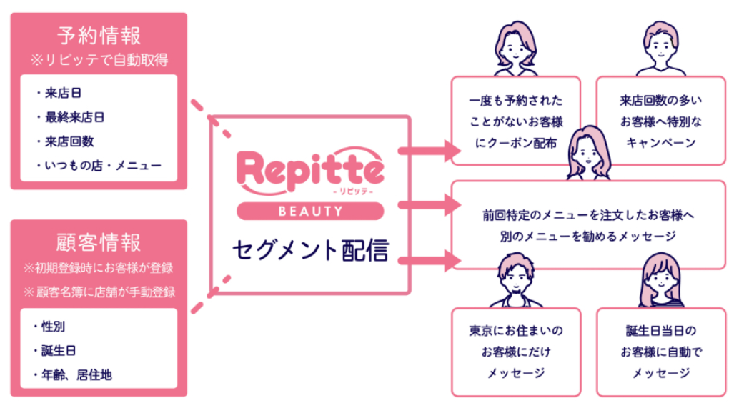 LINE公式アカウントとリピッテビューティーの予約システムを連携することで、リピート率の向上が期待できます。特に、リピッテビューティーのセグメント配信機能を活用することで、顧客の属性に合わせた最適なメッセージを送信し、再来店を効果的に促すことが可能です。また、適切なタイミングでお得なキャンペーン情報を配信することで、客単価の向上や、売上アップにも貢献します。LINE公式アカウントとリピッテビューティーの組み合わせは、効率的なリピーター獲得に最適なツールです。