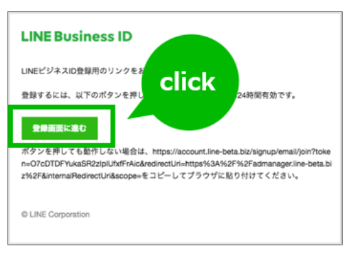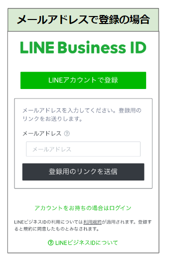 メールアドレスを入力し、「登録用のリンクを送信」を選択し、その後、指定したメールアドレスに「〔LINEビジネスID〕登録用リンク」という件名のメールが届きます。メール内の「登録画面に進む」をクリックし、画面の指示に従って必要項目を入力することで、LINEビジネスIDの登録が完了します。