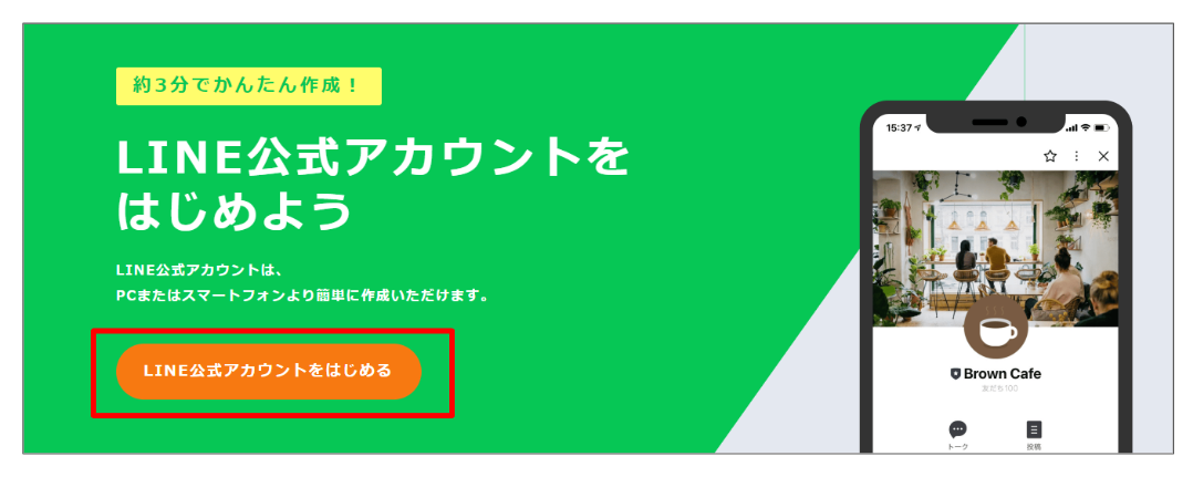 ①LINE公式アカウント作成ページを開きます。