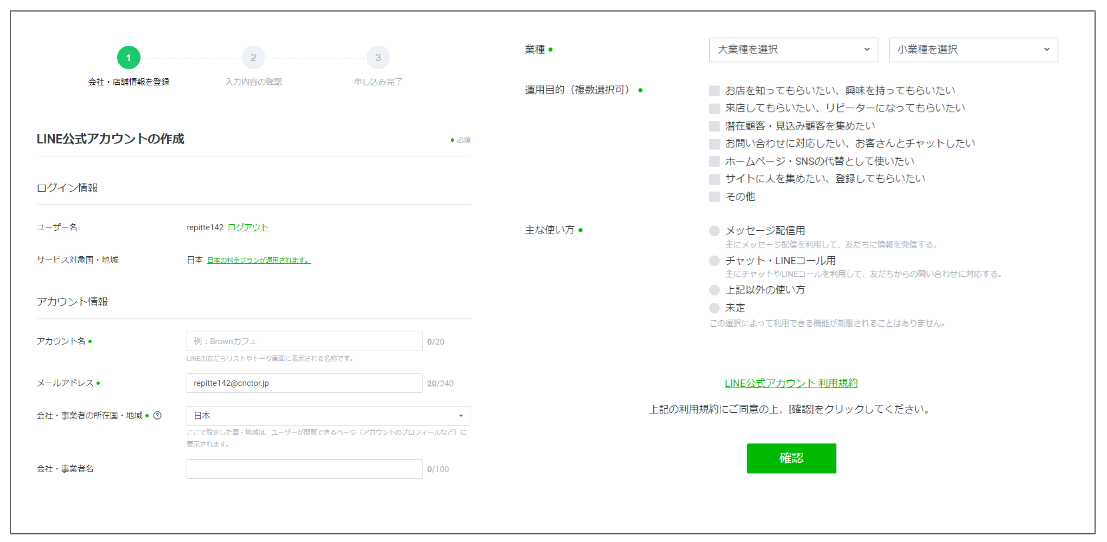 ⑤LINE公式アカウントの作成フォームに必要事項を入力して、LINE公式アカウントを作成してください。