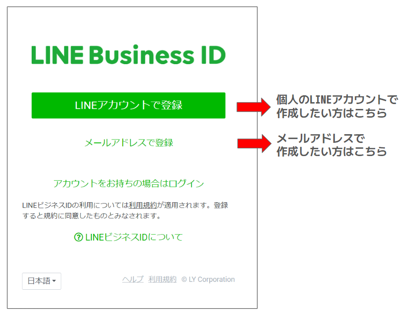 ②「LINEアカウントでログイン」または、「ビジネスアカウントでログイン」をタップします。