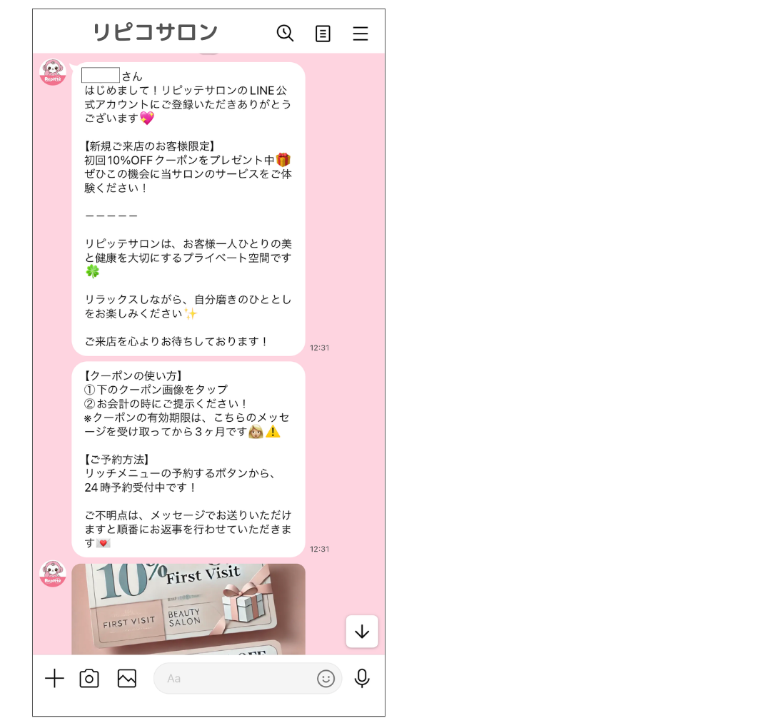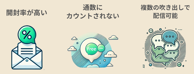 LINE公式アカウントのあいさつメッセージは、友だち追加後すぐに自動送信されるため、非常に高い開封率を誇ります。友だち追加直後は、ユーザーがそのアカウントに対して期待や関心を持っているタイミングです。そのため、あいさつメッセージを工夫することで、特典情報やサービスの魅力を確実に伝えることができ、次のアクション(購入や予約)を促すことができます。