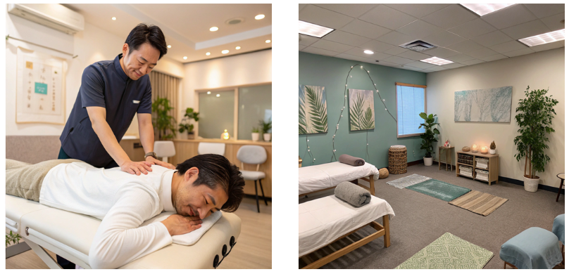 画像: 明るい施術スペースや、施術風景を映した写真。