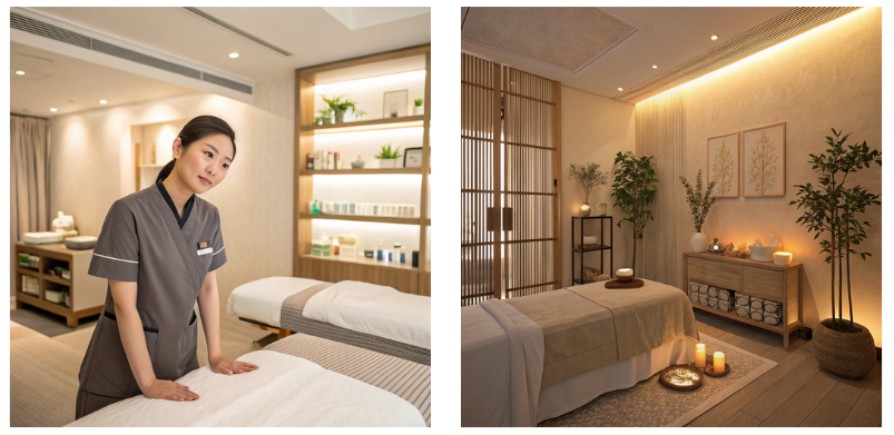 画像: 落ち着いた照明の施術ルームや、アロマを取り入れた空間の写真。