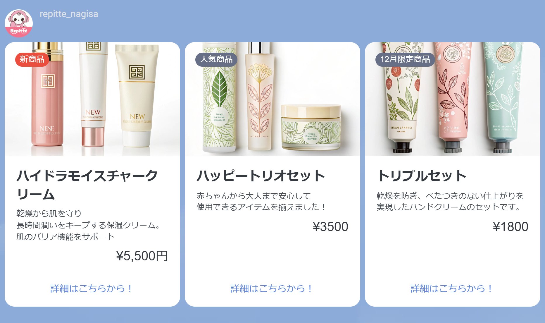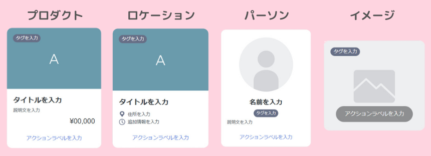 商品やサービスの紹介に最適なタイプです。商品画像、説明文、価格をカード内に表示し、各カードに購入ページや詳細情報へのリンクを設定できます。新商品の告知や人気商品の一覧表示に活用すれば、視覚的な魅力を伝えながら、効果的に顧客の興味を引きつけます。