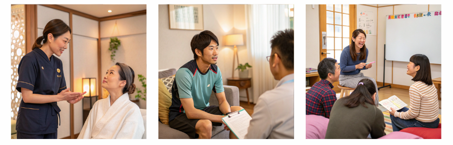 リラクゼーションサロン➩施術の説明を行うスタッフと安心して受けるお客様のやり取り