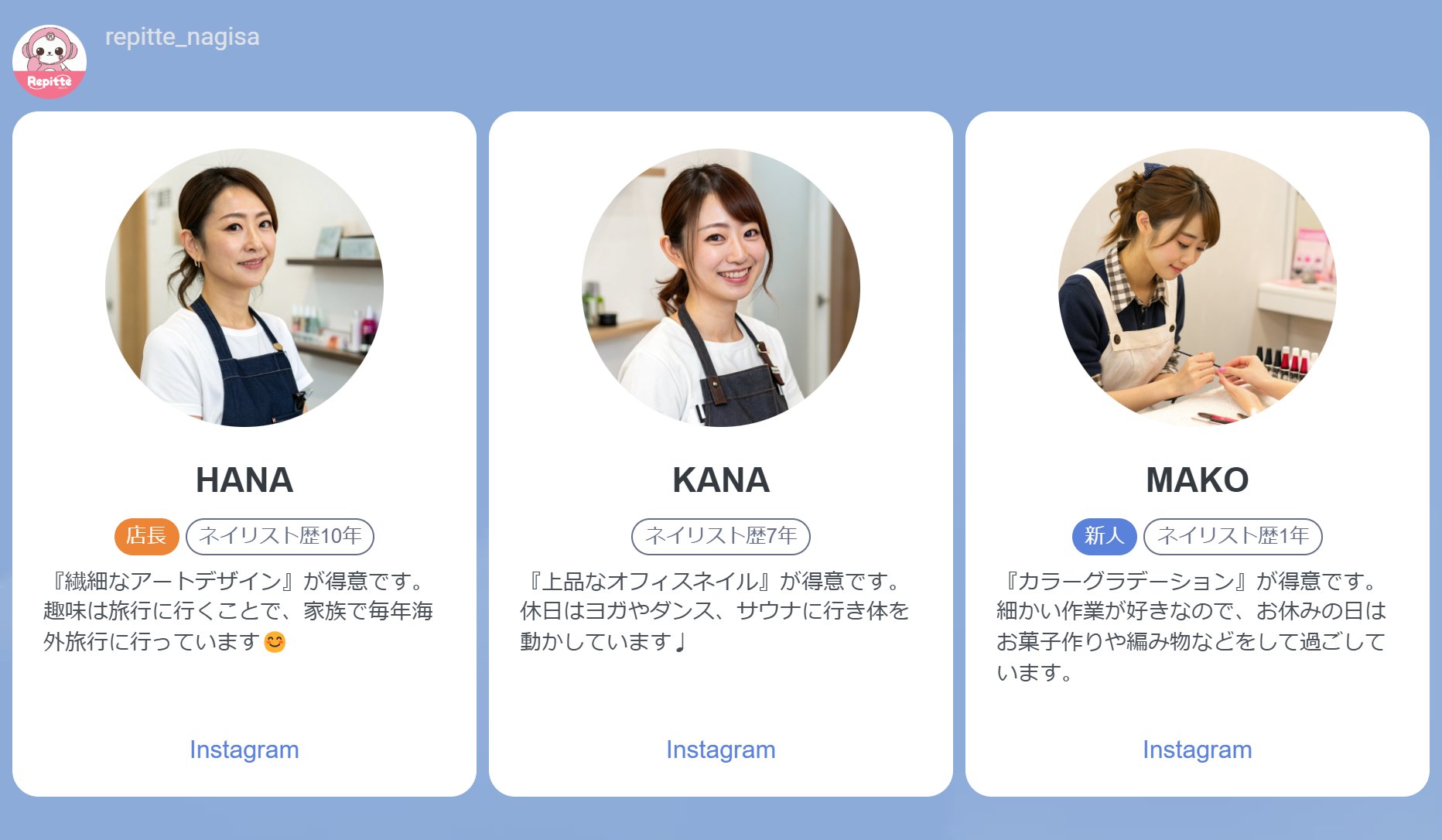 スタッフや関係者を紹介するのに適したタイプです。写真とともに名前や役職、得意分野などのプロフィールを掲載することで、初来店のお客様に安心感を与え、スタッフとの距離を縮めるきっかけを作ります。リピーター獲得にも効果的です。