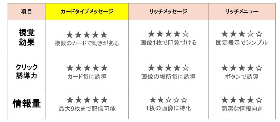 特にカードタイプメッセージは、複数の情報を整理しながら視覚的に訴求できるため、サロン業務での活用におすすめです。以下の表で、これらの形式の違いや用途を分かりやすく比較しています。