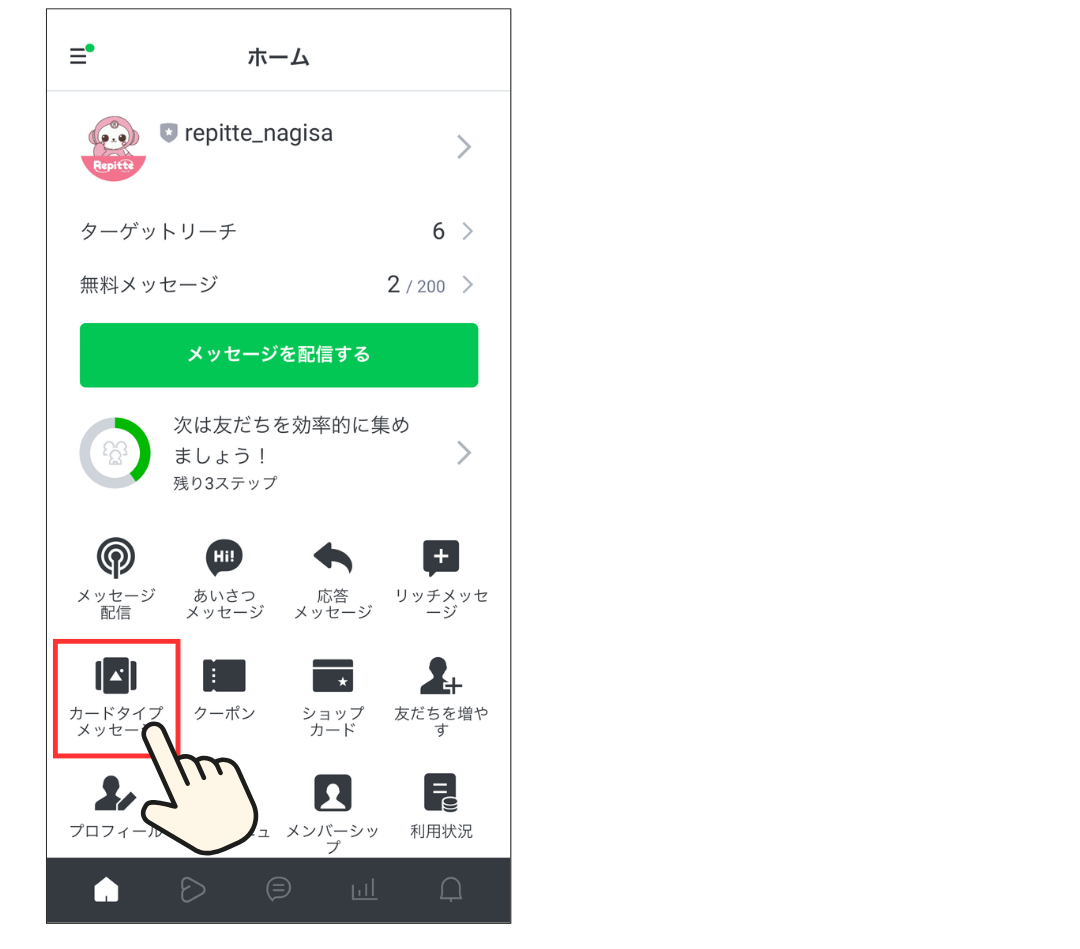 ①LINE公式アカウント管理画面から「カードタイプメッセージ」を選択