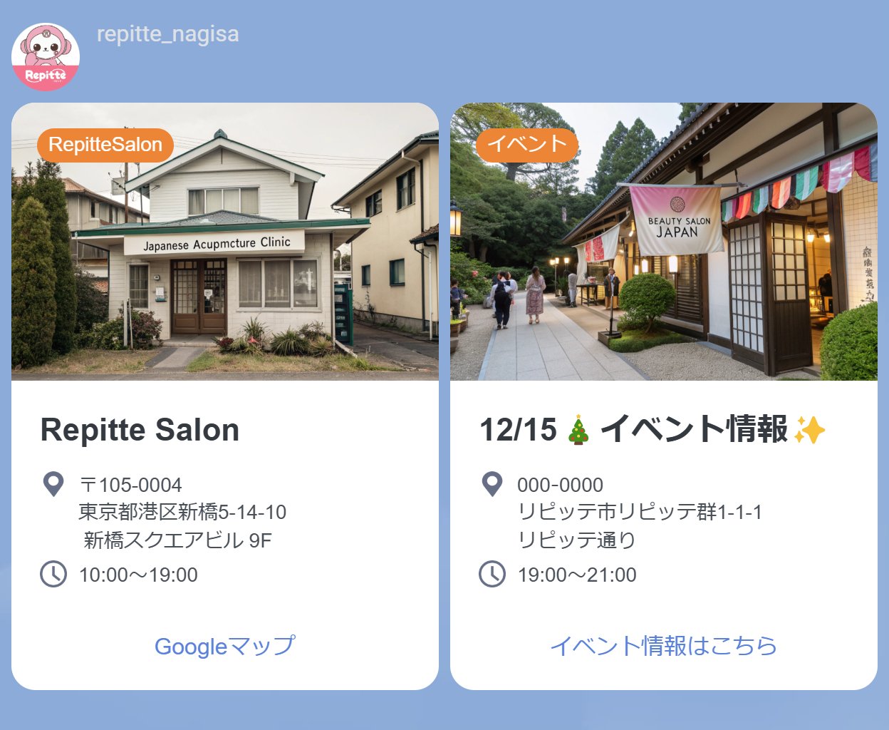 店舗やサロンの所在地、イベント会場へのアクセス方法を案内するのに適したタイプです。地図や住所、営業時間を記載し、Googleマップへのリンクを追加することで、ユーザーをスムーズに誘導できます。新規顧客の来店を促進したり、イベント集客に役立ちます。
