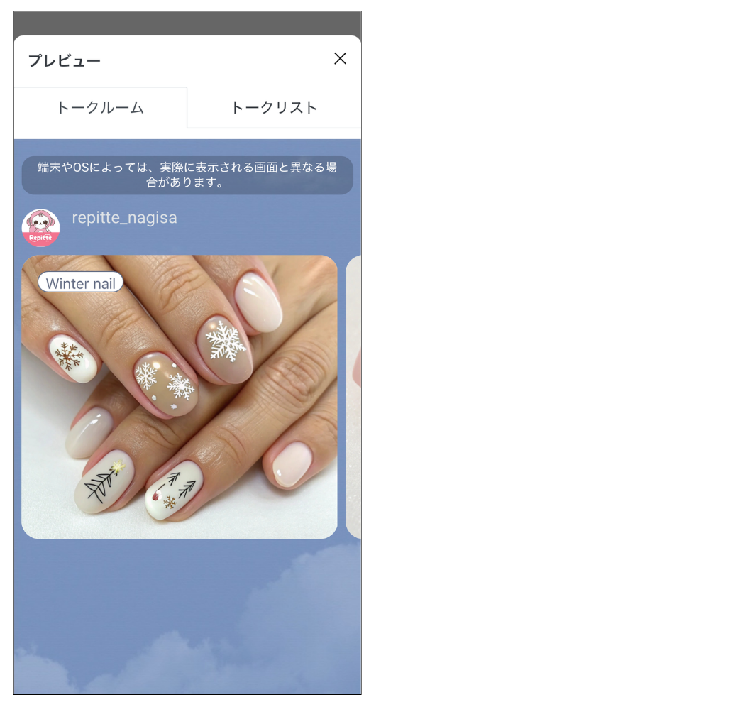 カードタイプメッセージは、短く簡潔なテキストが鍵です。1~2行で要点を伝え、「新作ネイルデザイン登場!」や「今だけ限定クーポン配布中✨」のようなキャッチフレーズを心がけましょう。